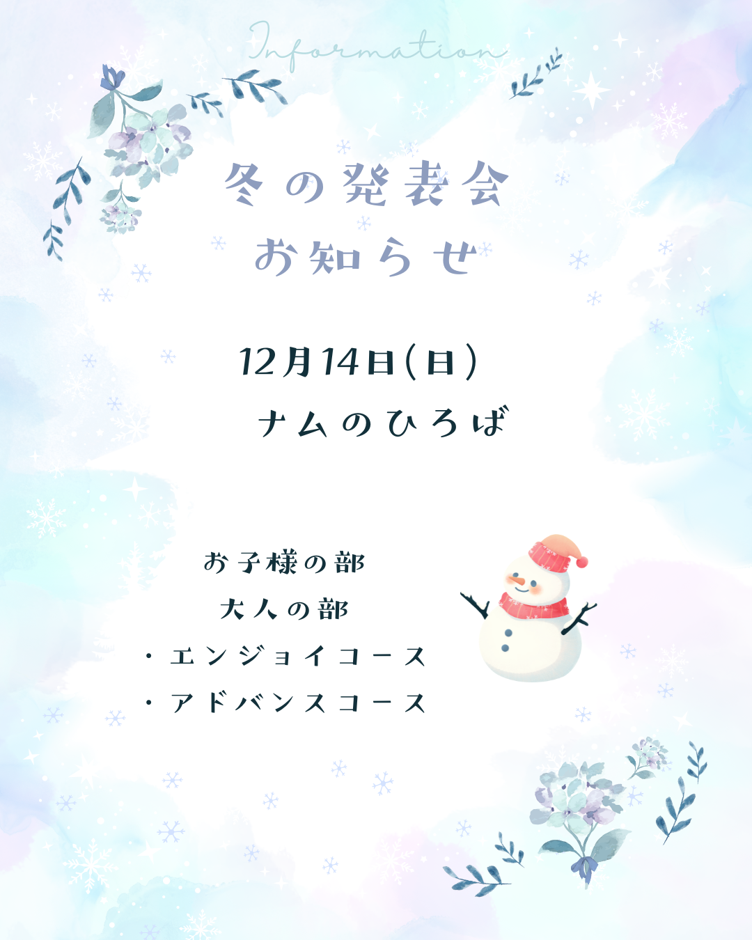 ♪冬の発表会♪ 12月14日(日)・ナムの広場 くつろぎミュージックの 冬の発表会が開催されます! 開演13:00から 舞台での演奏に、わくわくとドキドキの生徒さま♪ どなたでも入場いただけます♪ くつろぎミュージックのあたたかな雰囲気を 発表とともに感じてください!