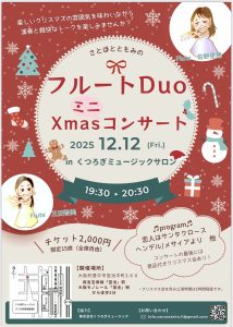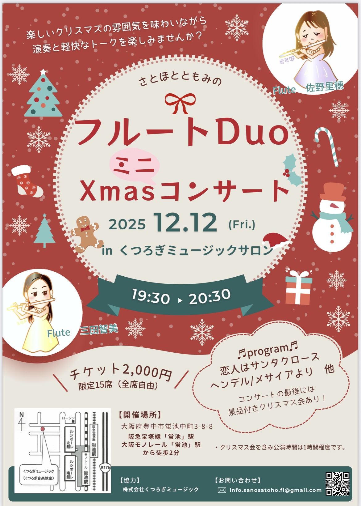 フルートDuo ♪Xmasミニコンサート♪ フルートDuo Xmasミニコンサート♪ 12月12日(金) くつろぎミュージックサロン 19:30~20:30 くつろぎのフルート講師 佐野里穂先生による 楽しいクリスマスコンサートです! チケット:2,000円(限定15席) アットホームな会場ですので、お早めにご予約ください☆